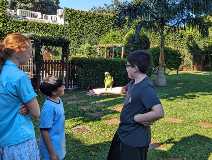 Meet Matti – the newest member of the Primavera English team. He lives out in our yard and loves to eat peanuts and fruit. He’s super friendly and happy to hang out with whoever comes to visit. So when our young students need fresh air or a break in their studies, the parrot’s cage is the perfect destination. Practicing new vocabulary, or grammar concepts is always easier in this environment away from the pressure of ‘getting it right’ in the classroom.