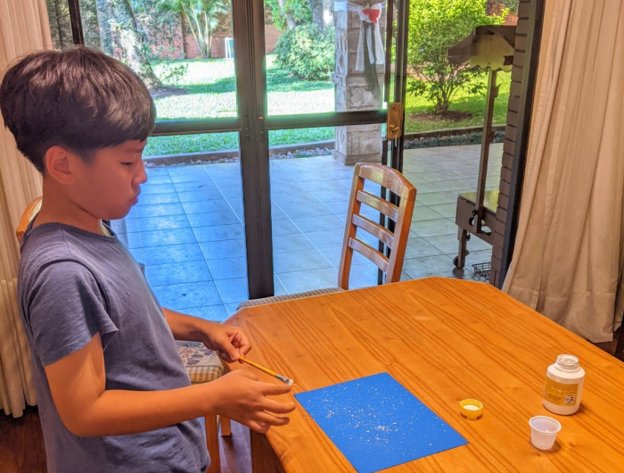 The vocab for the last week had been astronomy, gaze, universe, telescope, reflect among others. Time to move on but one more class of review was needed, the final tap of the hammer on the nail. All weekend long my brain weaved in and out of various topics concerning life and the general upheaval of the world but somehow, it always returned again and again to this specific class; how can I make these words interesting so ten-year-old Felix remembers them? Monday morning arrived and as I set off for an early morning jog, the idea came; splatter paint! We could create a universe, name the stars and constellations, and create stories that would coincide with the mini constellations we created on our paper.